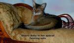The Abyssinian is a cat with a distinctive ticked coat. Each hair has a base color with three or four darker-colored bands; the hair is the lighter color at the root, and the darker "ticking" color at the tip. Sherry Baby's color is called "Ruddy". The coat has a warm reddish-brown base, with black ticking. The Ruddy's feet and the backs of the hind legs are always black.